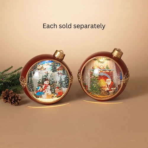 Christmas abounds in these 7.75-in diameter gold filigree wrapped matte red ornaments. Battery Operated lighted, musical spinning water globe. Gently swirling glittered water around a lighted detailed holiday scene centering around Santa placing presents by the Christmas tree and a lighted detailed holiday scene centering around children making a snowman.
