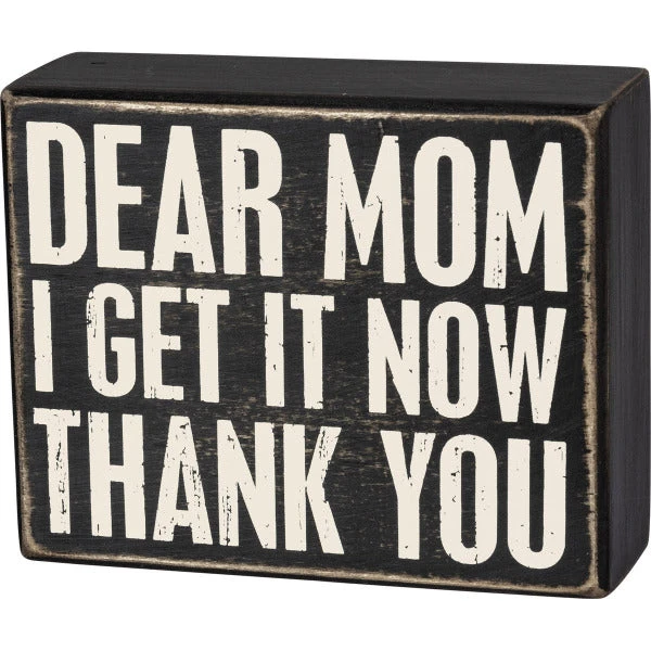 A classic black and white wooden box sign featuring a distressed “Dear Mom – I Get It Now – Thank You” sentiment. Easy to hang or can free-stand alone.