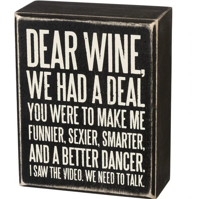 A classic black and white wooden box sign lending a distressed “Dear Wine, We Had A Deal – You Were To Make Me Funnier, Sexier, Smarter, And A Better Dancer. I Saw The Video. We Need To Talk.” sentiment. Easy to hang or can free-stand alone.