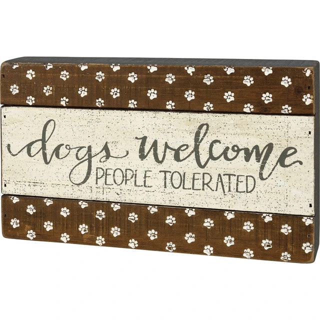 A wooden slat box sign featuring a hand lettered “Dogs Welcome People Tolerated” sentiment and debossed paw print designs with painted details. Easy to hang or can free-stand alone.