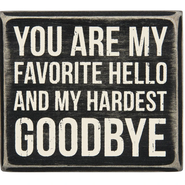 A classic black and white wooden box sign featuring a distressed “You Are My Favorite Hello And My Hardest Goodbye” sentiment. Easy to hang or can free-stand alone.
