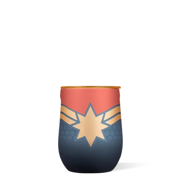 - Corkcicle stainless steel insulated stemless glass features Captain Marvel design, lid and coordinating silicone wings.