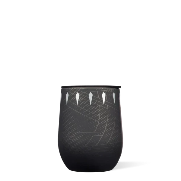 - Corkcicle stainless steel insulated stemless glass features Black Panther design, lid and coordinating silicone wings.