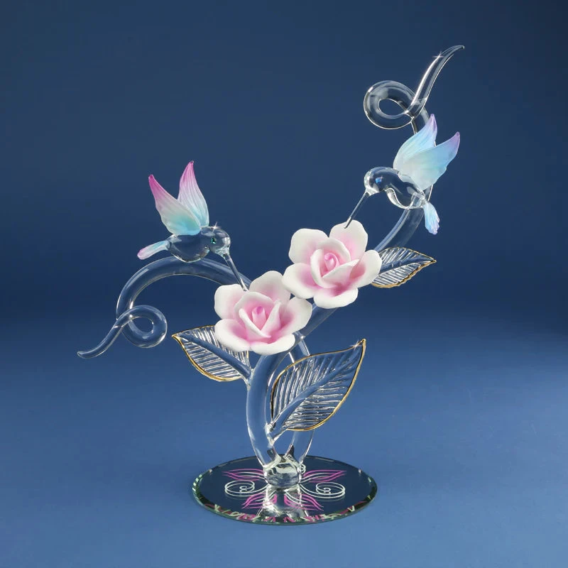 • Handcrafted glass sculpture of two hummingbirds poised over double pink porcelain roses on vines, placed on a hand beveled glass mirror.