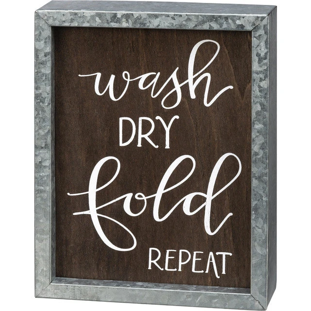 An inset wooden box sign featuring “Wash Dry Fold Repeat” sentiment. Easy to hang or can stand alone.