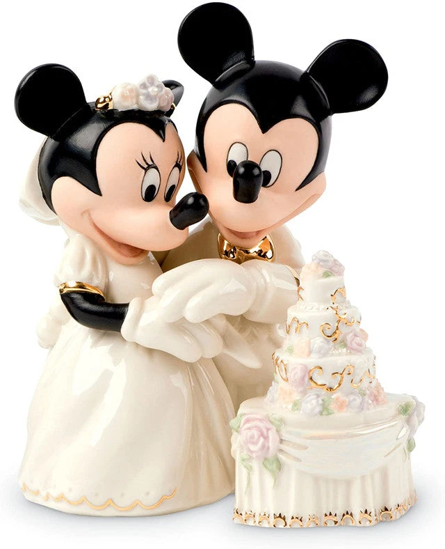 Oh, what a lovely dream Minnie is having. She and Mickey have had the most romantic wedding. Finally, it’s time for their first task together as mouse and wife… cutting the cake. Mickey is ever-so handsome in his morning coat with tails and a gold bow tie. Minnie wears a traditional ball gown. Crafted of hand-painted porcelain. Accented with 24 karat gold. Under license by Disney, which has reviewed this product for quality and authenticity.
