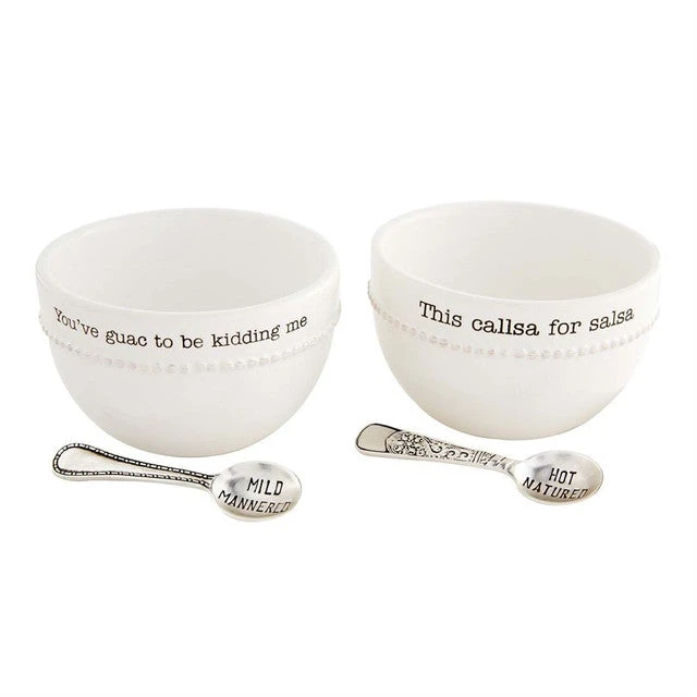 This 4-piece set includes two debossed ceramic dip bowls “You’ve guac to be kidding me” and “This callsa for salsa”. It includes two silverplate spoons stamped “Mild Mannered” and “Hot Natured”.