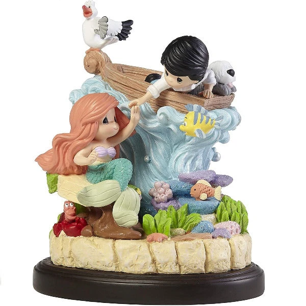 Nothing can keep true love apart, not even ocean depths. Perhaps nothing illustrates this more than the love story between Princess Ariel and Prince Eric, a tale that has captured the hearts of Disney’s The Little Mermaid fans for decades. This glorious musical figurine is inspired by the unique bond they share. This musical plays the tune “Part Of Your World”. Two worlds unite; Prince Eric’s above the water and Ariel’s colorful world beneath. The familiar faces of Flounder, Sebastian, and Scuttle look on to witness love grow. Fans of Disney’s mermaid princess, as well as Disney collectible gifts in general, will enjoy this musical figurine. Give as an unforgettable birthday gift, holiday present, or simply to surprise someone who loves this Disney Princess.