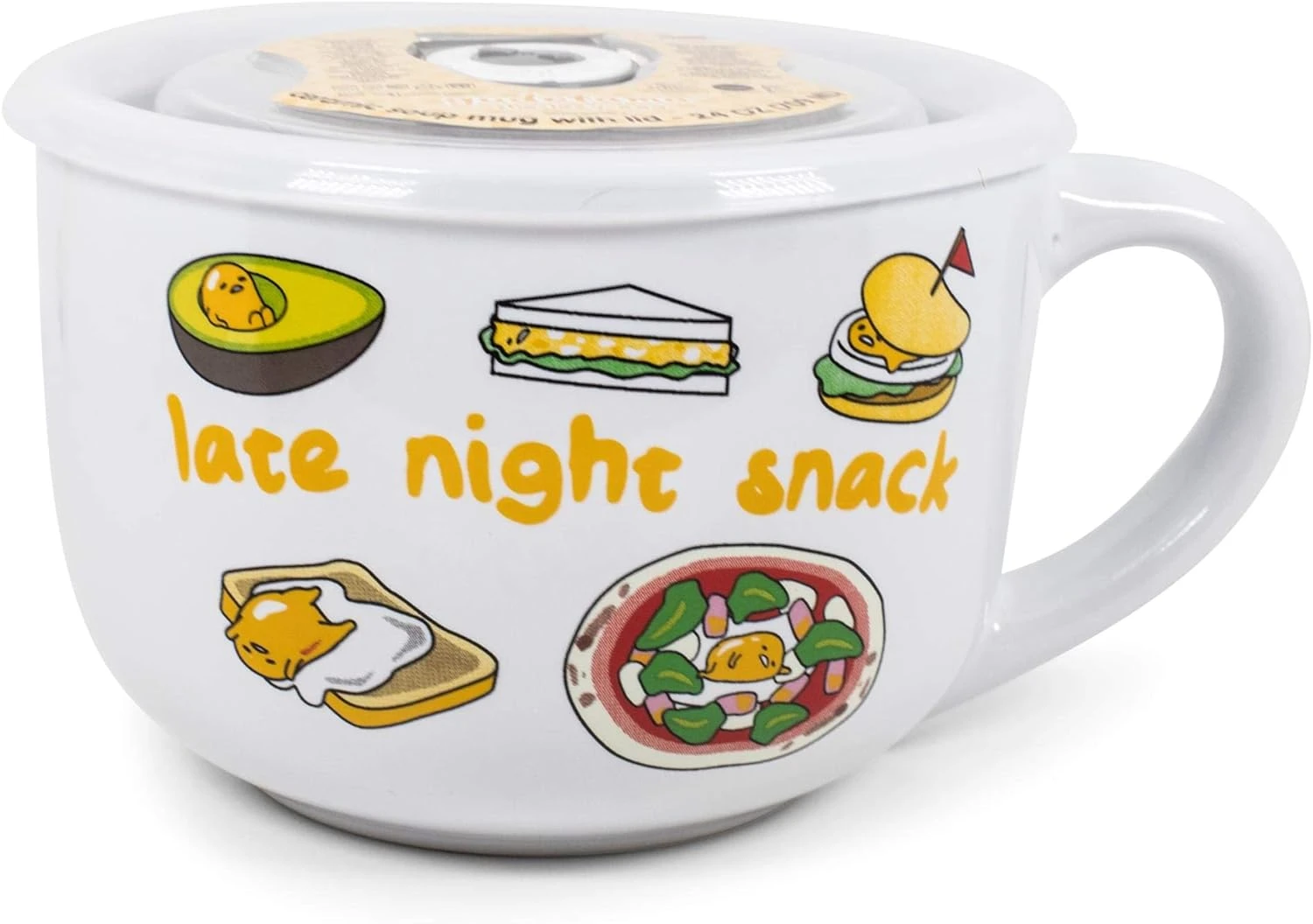Enjoy this Gudetama 24oz ceramic soup mug with a vented lid. This mug features Gudetama and some yummy Late Night Snacks. Easily store your extra soup with this soup mug with a lid!