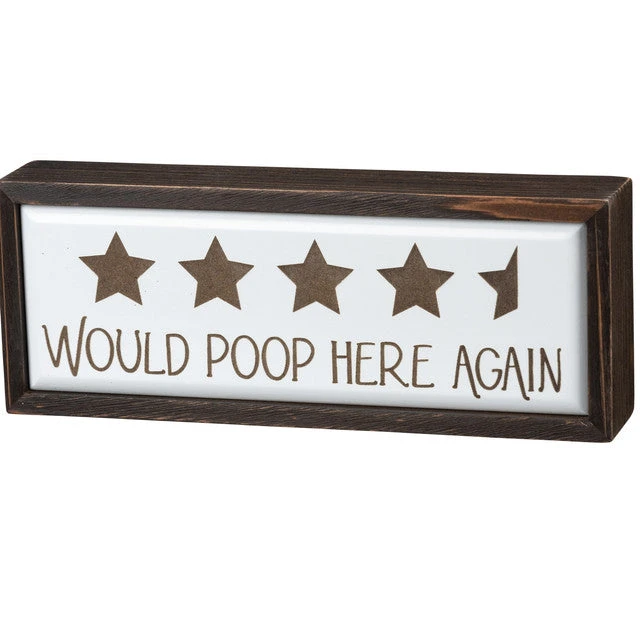 A wooden box sign featuring a “Wood Poop Here Again” sentiment with design of four and a half stars. Features a tile-like finish. Easy to hang or can free-stand alone. Complements well with other pieces in collection.