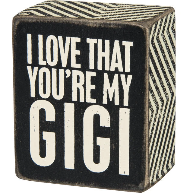 A classic black and white wooden box sign featuring a distressed “I Love That You’re My Gigi” sentiment with zigzag trim designs. Easy to hang or can free-stand alone.