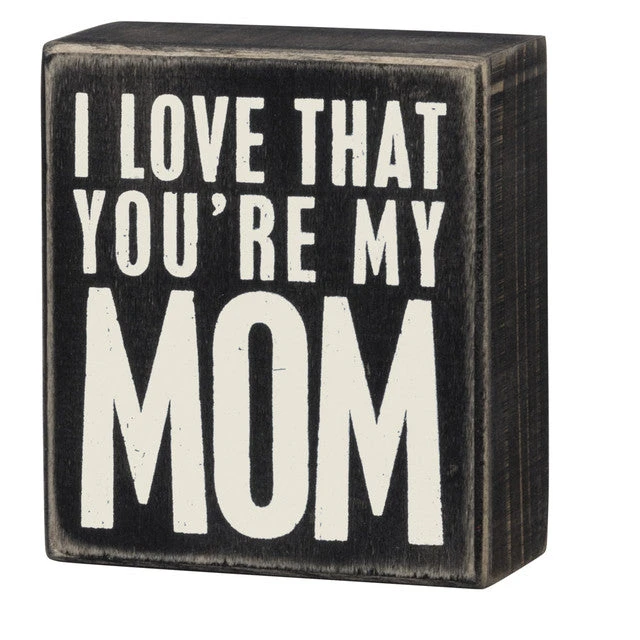 A classic black and white wooden box sign featuring a distressed “I Love That You’re My Mom” sentiment. Easy to hang or can free-stand alone.